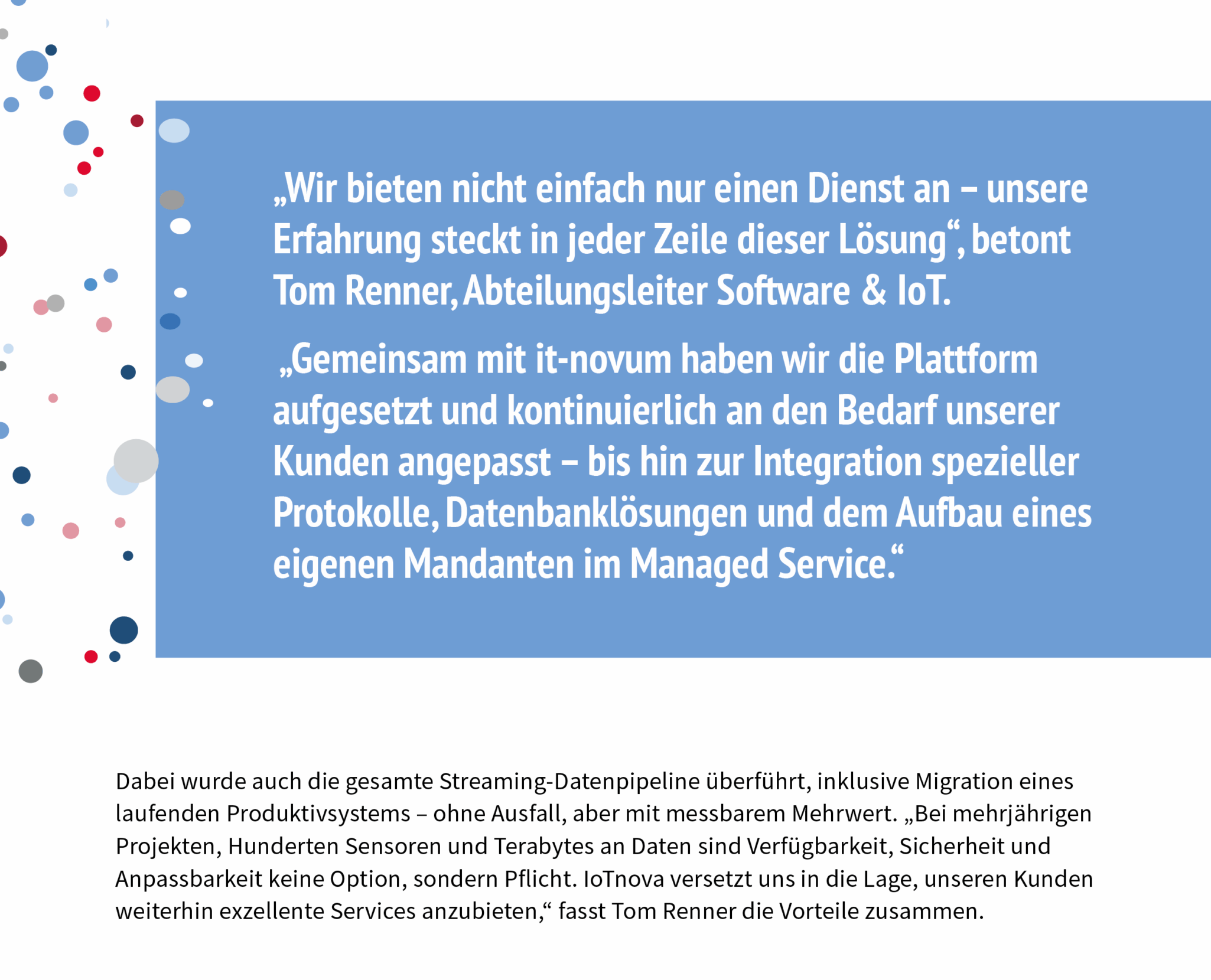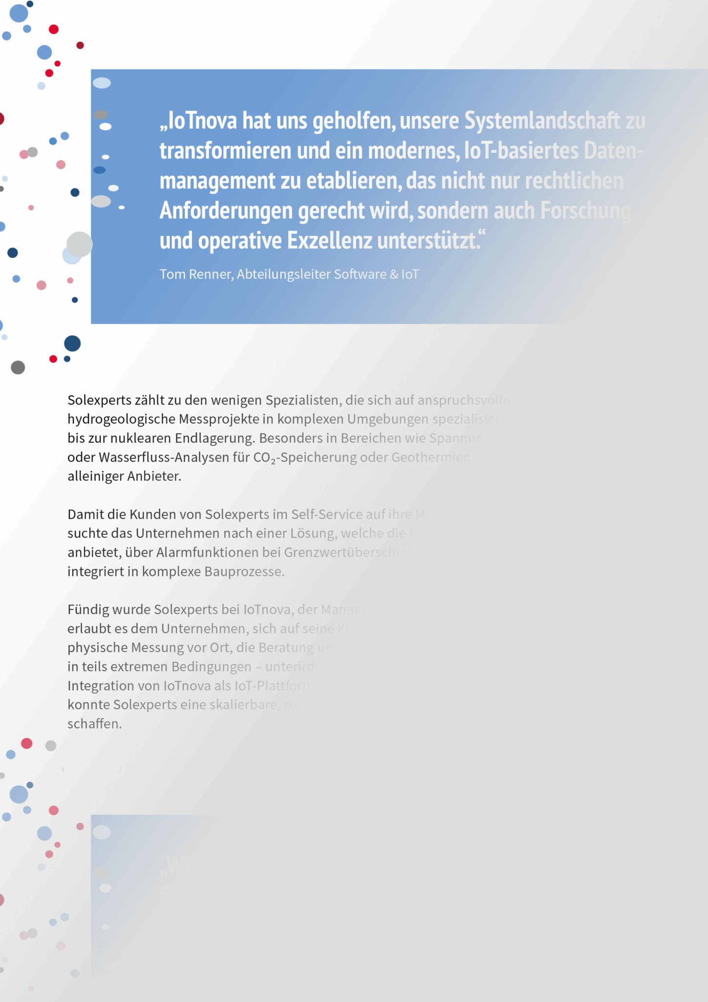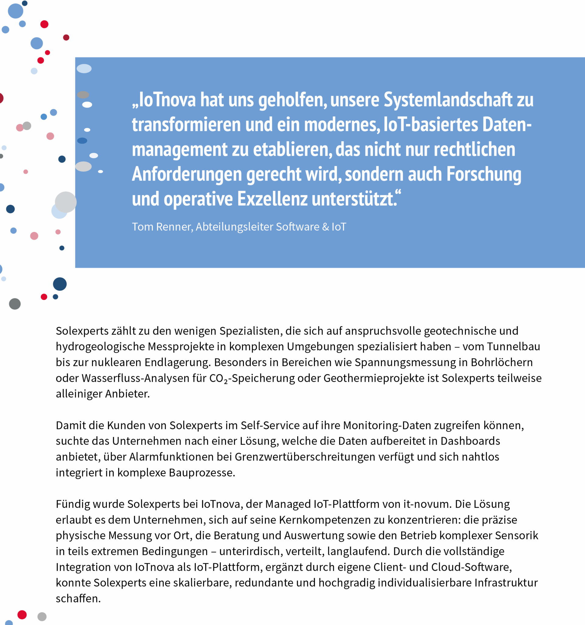 Solexperts gehört zu den führenden Spezialisten für geotechnische und hydrogeologische Messprojekte – von Tunnelbau bis Geothermie. Um Kunden jederzeit Zugriff auf präzise Monitoring-Daten zu ermöglichen, setzt das Unternehmen auf IoTnova, die Managed IoT-Plattform von it-novum. Die Lösung liefert nicht nur Echtzeit-Dashboards und intelligente Alarmfunktionen, sondern integriert sich auch reibungslos in komplexe Bauprozesse. So kann Solexperts sich ganz auf seine Kernaufgaben konzentrieren: präzise Messungen, fundierte Analysen und den Betrieb hochkomplexer Sensorik unter extremen Bedingungen. Mit IoTnova wurde eine skalierbare, sichere und individuell anpassbare Dateninfrastruktur geschaffen.